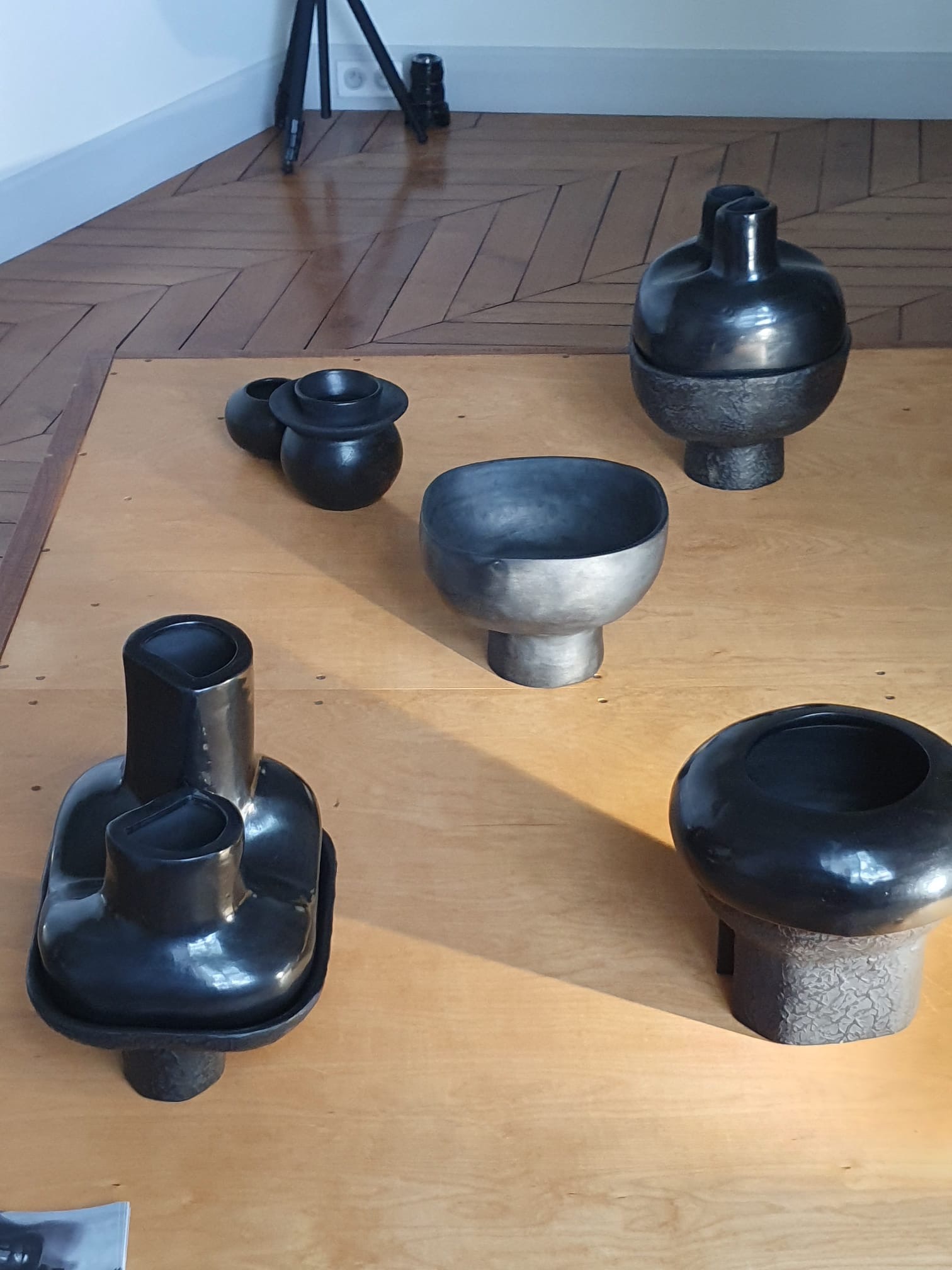 Raúl de la Cerda, pour sa collection Heritage, les 4 vases ont été entièrement façonnés à la main par l’artisan Felipe Fabian Pedro aves des terres noires de San Bartolo Coyotepec, la région traditionnelle des objets en terre noire de Oaxaca. La terre devient noire à la cuisson a 1050°C .